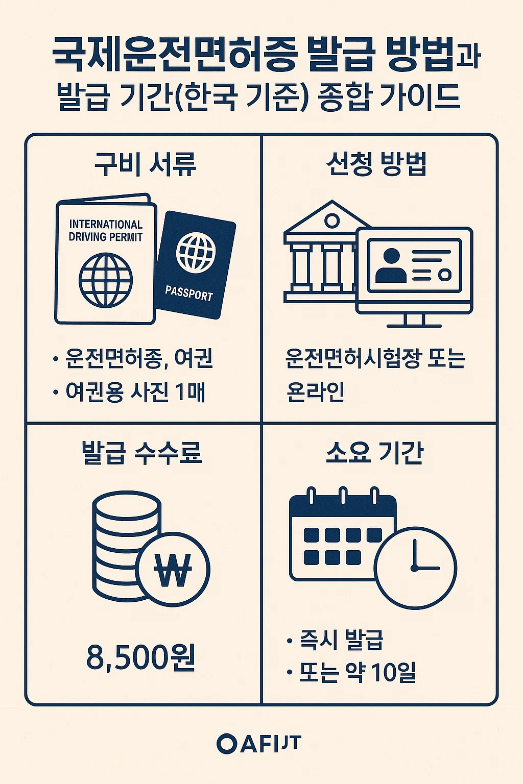- 국제운전면허증(IDP): 유효 1년, 해외에서 공식 운전 자격 증명
