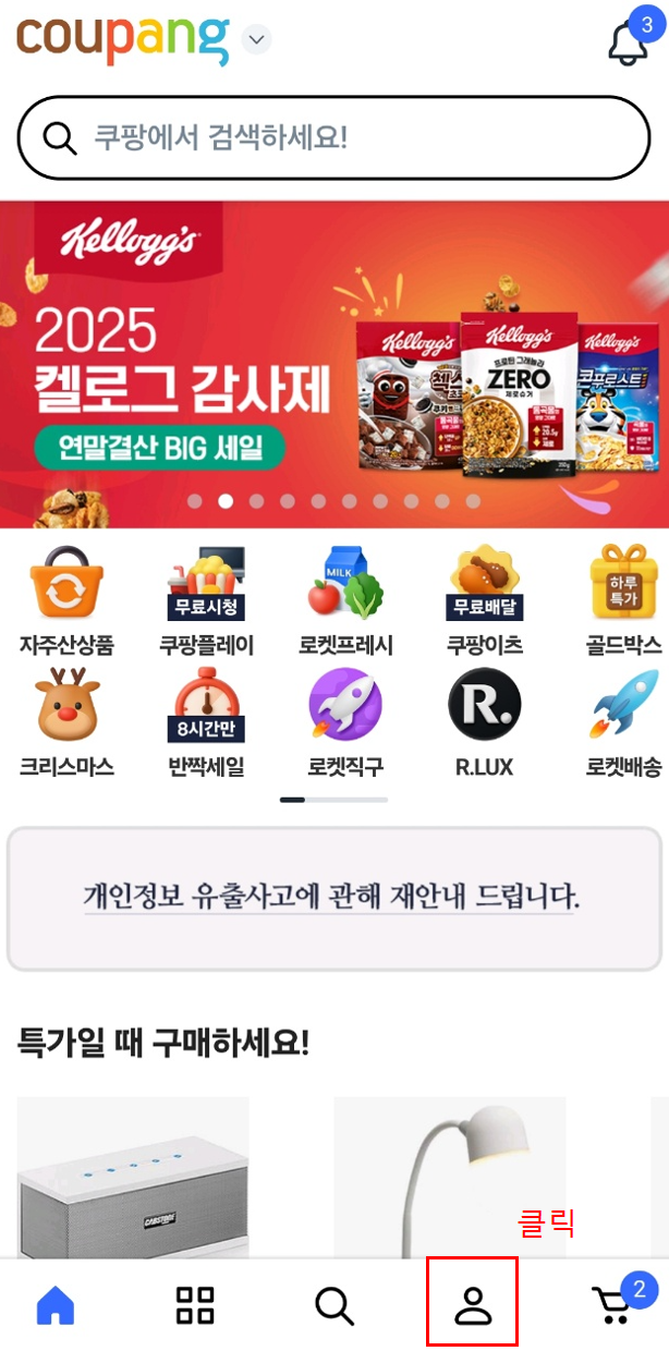 '마이쿠팡' 화면 캡쳐 방법 : 앱에서 쿠팡 로그인 후 다음 순서에 따라 진행 합니다.