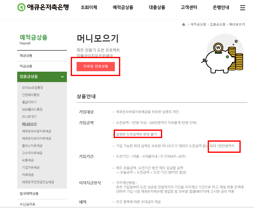 애큐온 홈페이지 링크 : 예적금상품 > 입출금상품 > 머니모으기 [ p2 ]