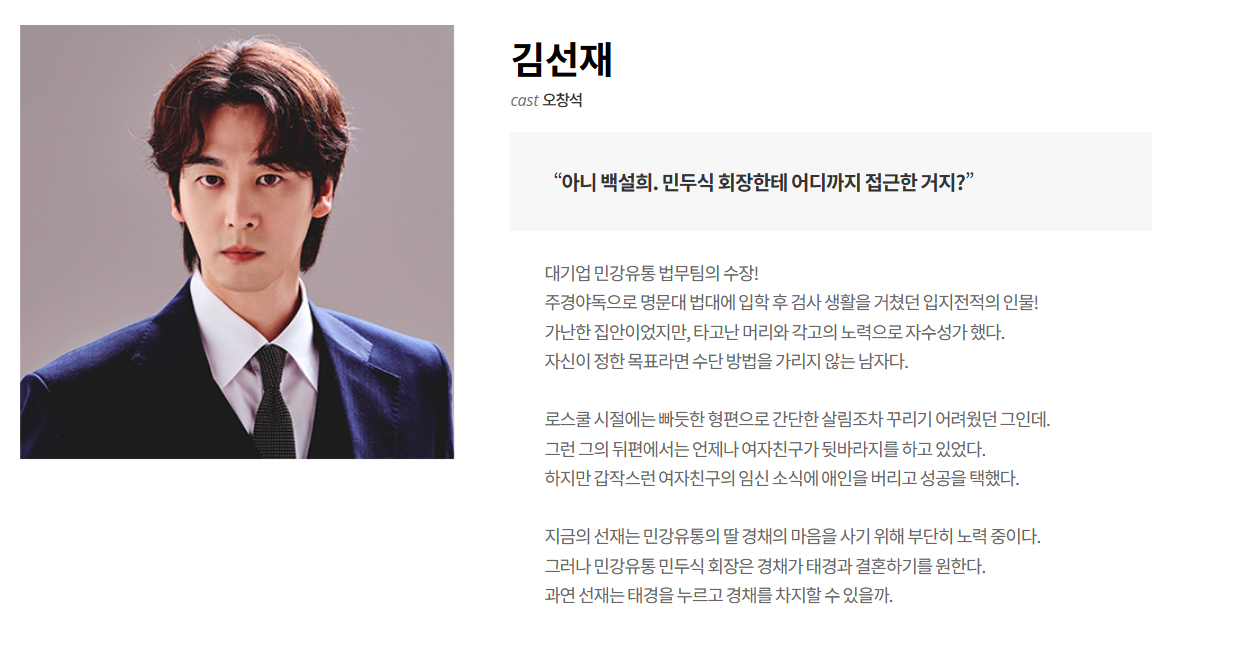 민강유통 법무팀장. 로스쿨 시절 자신을 뒷바라지한 여자친구 백설희를 임신 사실을 알면서도 버리고 성공을 택한 배신자. 표면적으로는 민경채의 심복처럼 보이지만, 실제로는 자신만의 숨겨진 목적을 가지고 모두를 이용하는 진짜 흑막.