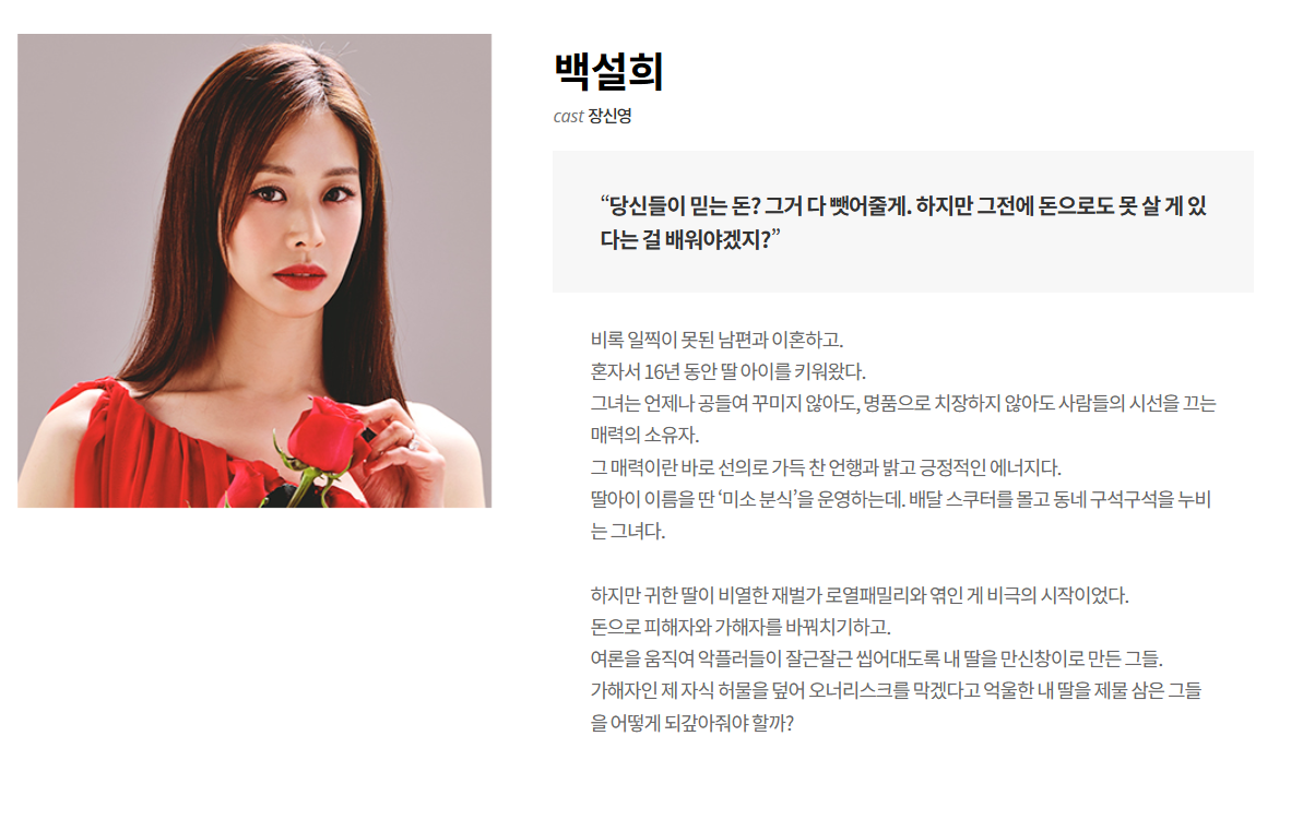 분식집 '미소 분식'을 운영하는 백설희와 딸 백미소의 평범하지만 행복한 일상이 그려진다. 백미소는 재벌가 민강유통과 엮이면서 억울한 사고의 피해자가 되지만, 재벌가는 돈으로 증인을 매수하고 언론을 조종해 미소를 오히려 가해자로 만들어버린다. 악플과 사회적 낙인에 시달리던 백미소는 결국 스스로 생을 마감한다. 딸의 죽음을 목격한 백설희는 복수를 결심하고, 조력자 장연숙과 함께 미국으로 떠난다.