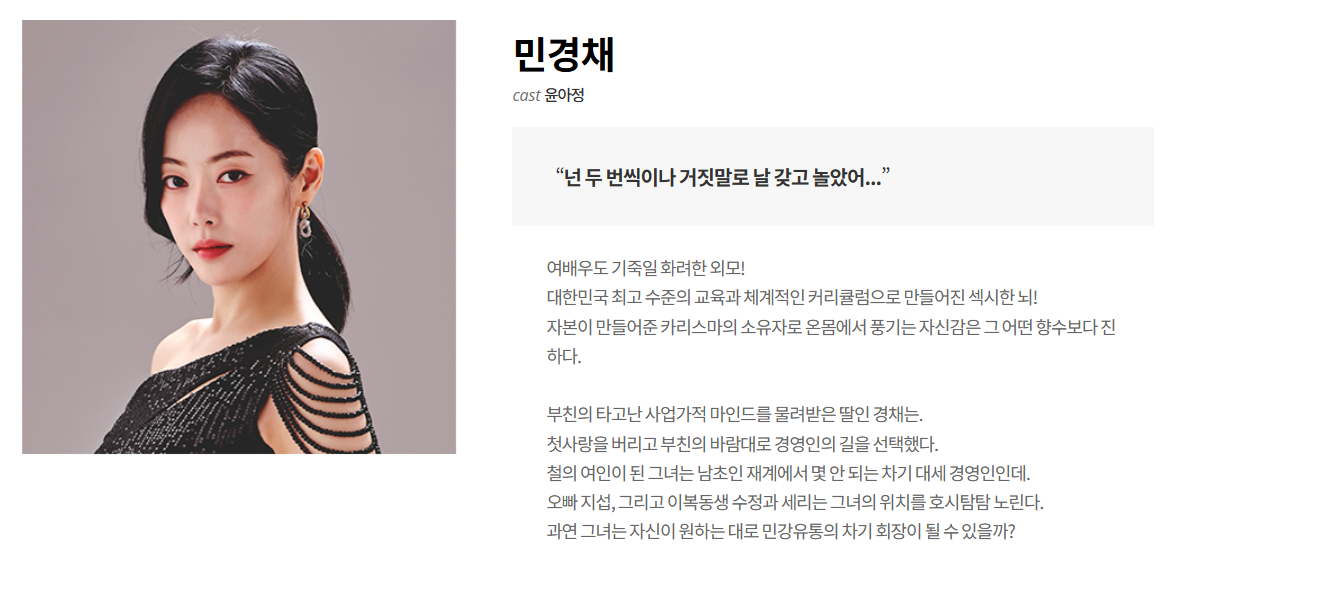 민강유통 창업주의 딸로, 차기 회장 자리를 노리는 야심가. 화려한 외모와 카리스마로 주변을 장악하지만 내면은 냉혹하고 교활하다. 첫사랑을 버리고 부친의 바람대로 경영인의 길을 걸어왔다. 백설희에게 있어 핵심 복수 대상.