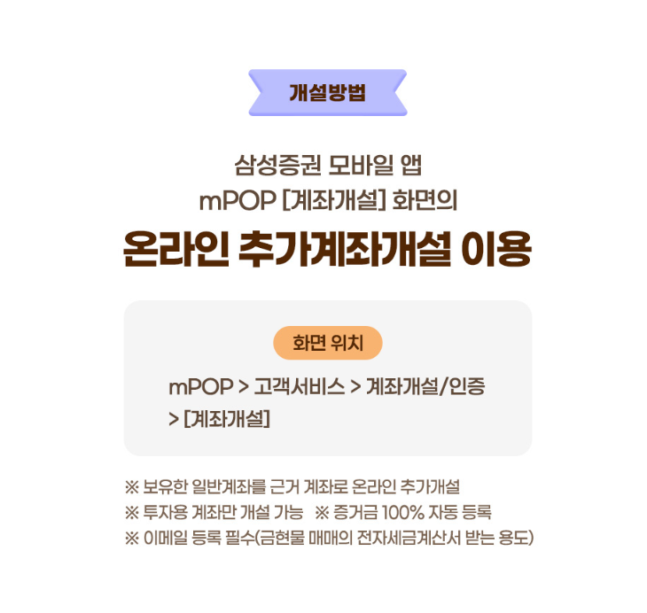 - 참여 방법: 계좌 개설 후 삼성증권 앱(mPOP)이나 홈페이지 이벤트 페이지에서 '이벤트 신청' 클릭