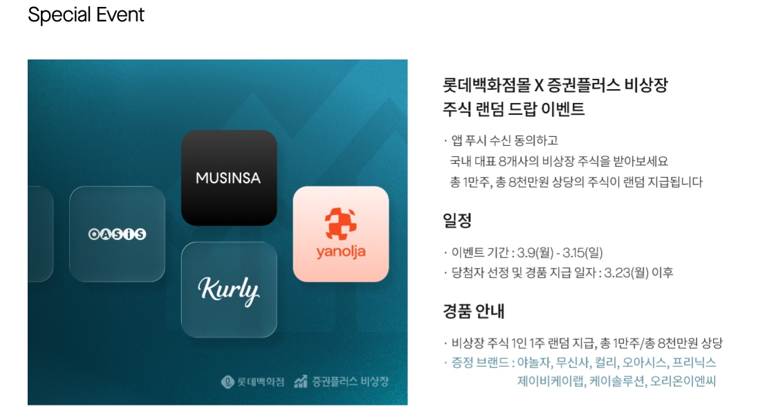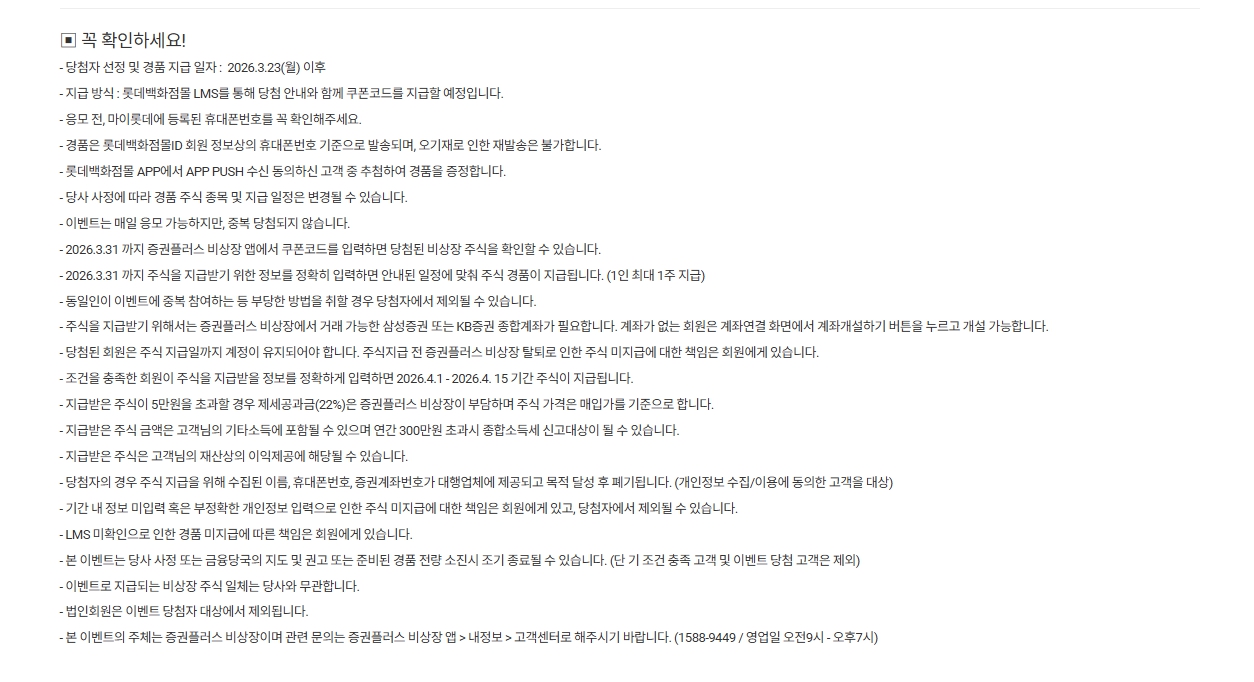 - ✅ 데드라인 준수 (3월 31일까지) 3/23(월) 이후 쿠폰코드가 문자로 발송되면, 2026.3.31(화)까지 증권플러스 비상장 앱에 쿠폰코드를 입력하고 주식 지급 정보를 정확히 등록해야 합니다. (실제 주식 지급일: 4/1 ~ 4/15)