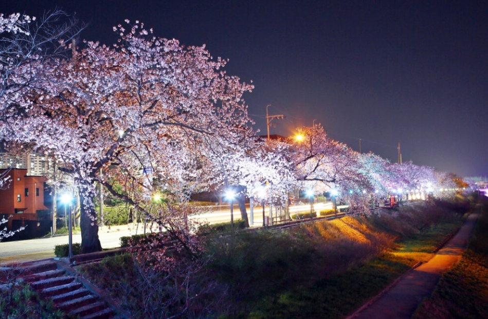 조명과 벚꽃의 컬래버. 강물에 반사된 불빛이 낭만적인 야간 명소
